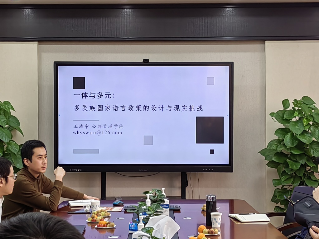 王浩宇老师就“一体与多元——多民族国家语言政策的设计与现实挑战”为主题进行了分享,从跨学科视角对语言问题进行了深入剖析,认为语言问题首先是重大的政治议题,对多民族国家的社会稳定和长治久安具有重要影响,其次认为语言政策研究特别需要跨学科视角,要从多民族国家的政治经济整合、少数民族社会流动、行政效率提升等方面对语言政策进行设计,提出了语言首先是一种交流工具、其次是一种创新的资源、最后语言是一种权利的重要观点。最后王老师谈到了语言政策研究与其他领域的融合的可能性,如:法学、公共管理、社会学等,为语言政策跨学科研究提供了新的思路。