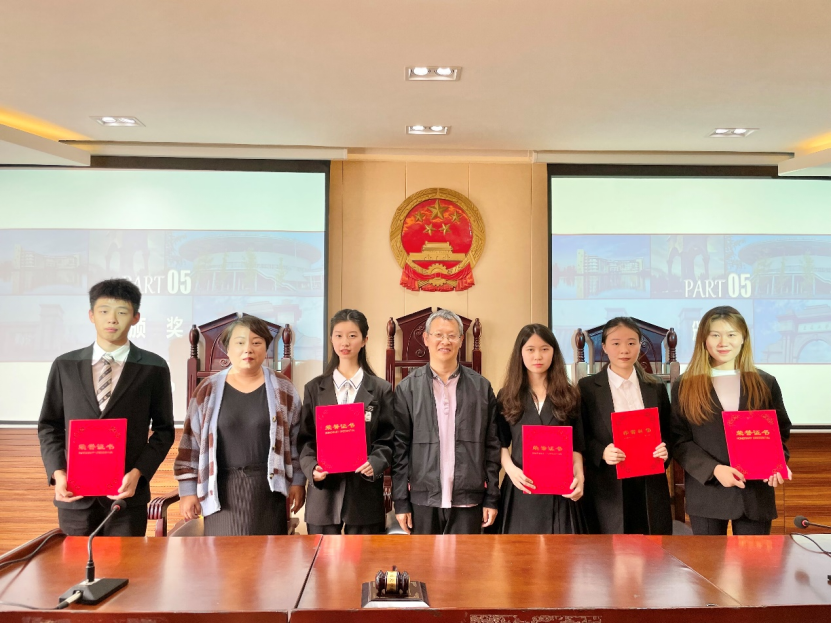 赛事已经接近尾声,王永杰院长统一宣布了经过组委会计算得出的决赛参赛团队的平均成绩和本次模拟法庭竞赛的获奖情况:肖晨莹团队荣获一等奖;周东尧、林欣悦团队荣获二等奖;段家红、屈雅琪、陶志鸿团队荣获三等奖,唐雯、樊瑶雪、陈薇羽、陈诗琪四个团队荣获优胜奖。王永杰院长、杨成良副教授、陈迎新副教授和颜诗树副教授,分别为获奖队伍颁奖并与参赛团队合影留念。