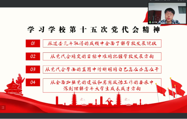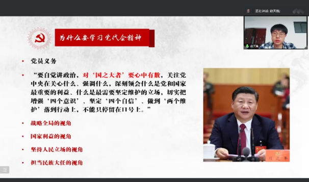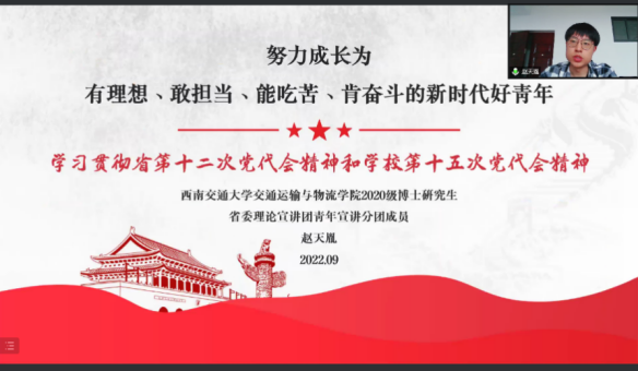 青年讲师团成员赵天胤为“青马工程”精英班、骨干班成员、研究生会、学生会全体学生干部和2022级新生举办线上专题报告会。为落实属地疫情防控要求,报告会采取线上形式召开。