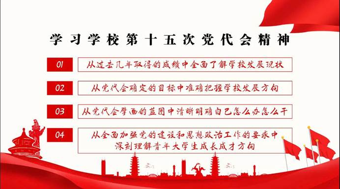 紧接着,赵天胤老师向同学们介绍了学校第十五次党代会的概况,并从多个方面展开,引导同学们深入理解此次大会的精神,包括过去几年学校取得的成绩,学校发展现状,学校第十五次党代会确立的目标、擘画的蓝图以及要求等,详细地为同学们介绍了学校的发展方向,并引领同学们要深刻理解青年大学生成长成才的重要意义。