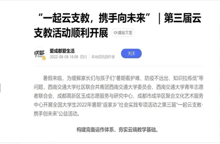 承办了我校第三届云支教志愿服务活动,356名志愿者对接成都数十所中小学,覆盖中小学生400余名,发起云支教公益课堂直播,直播人数超过2000人。