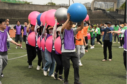 手举皮球,蜈蚣竞走。选手们相互用身体前后夹着大皮球,同时双手举起另一个大皮球,在球不落地的情况下,列成纵队,向前奔跑。双脚一起一落间,共同迈进,不仅考验着选手的协调力,更考验着他们相互配合的默契度。