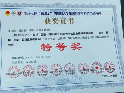 推出的作品“四川省2023届大学生就业困难问题调查——基于‘结构—行动’的双重分析视角”项目在本次竞赛中斩获特等奖,“‘物业敲门 村居共治’农集区多元共治模式研究——基于葛仙山镇2年的跟踪调研”项目斩获三等奖。
