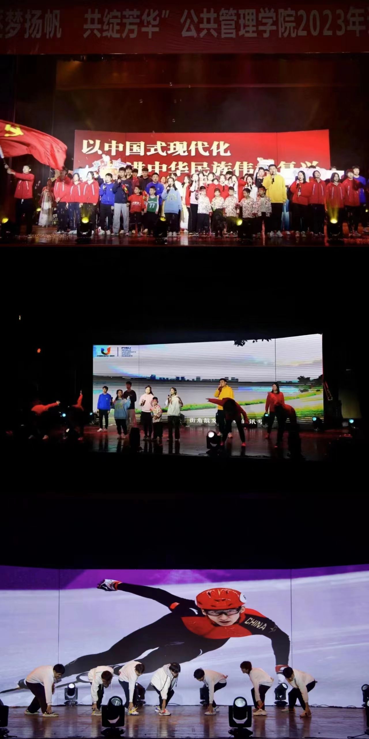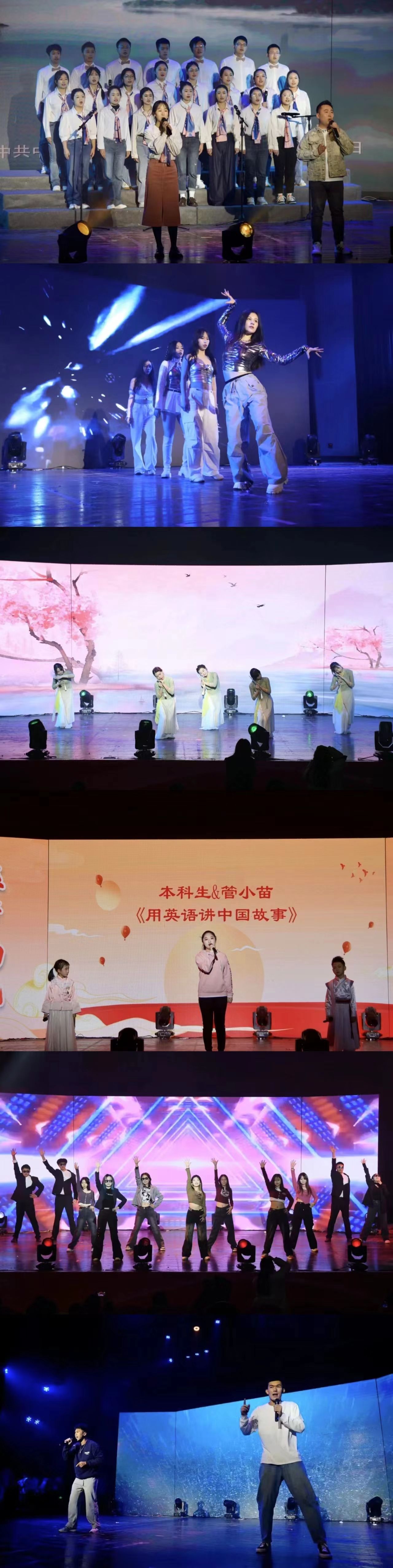 穿越历史的云烟,峥嵘岁月历久弥新;伴随岁月的回声,征途历程气势如虹。仰望历史的天空,中国故事熠熠生辉;跨越时间的长河,文化交流绵绵不断。本科生代表和管小苗的《用英语讲中国故事》向我们展示着文化自信,《全民运动会》用幽默诙谐的方式让大家感受到了体育运动的魅力;《体育梦·青春梦·中国梦》体现体育运动中蕴含着的民族精神,排球、足球、羽毛球……每一个中国人都享受着体育运动的无穷魅力,以健康的姿态迎接未来。瞧!大家在为跌倒的管小苗加油鼓劲,他勇敢的站起来,将接力棒继续传递下去!一代又一代中国人不断接下时代的接力棒,拼尽全力的向前奔跑,走向民族复兴、强国建设的崭新征途!