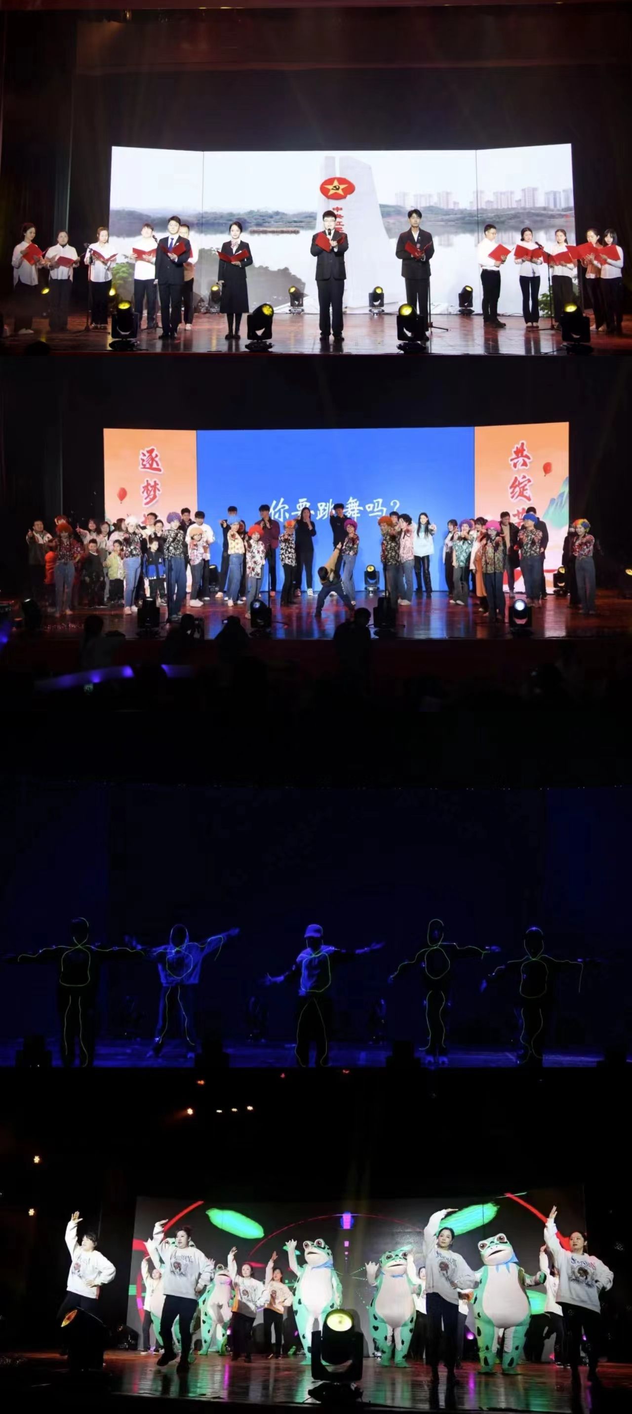 大幕初启,在精彩的乐队表演暖场后,主持人宣布演出正式开始。台上师生各展风采,舞动青春之美,唱响未来之声;台下观众齐聚一堂,尽享视听盛宴,欢度快乐时光……