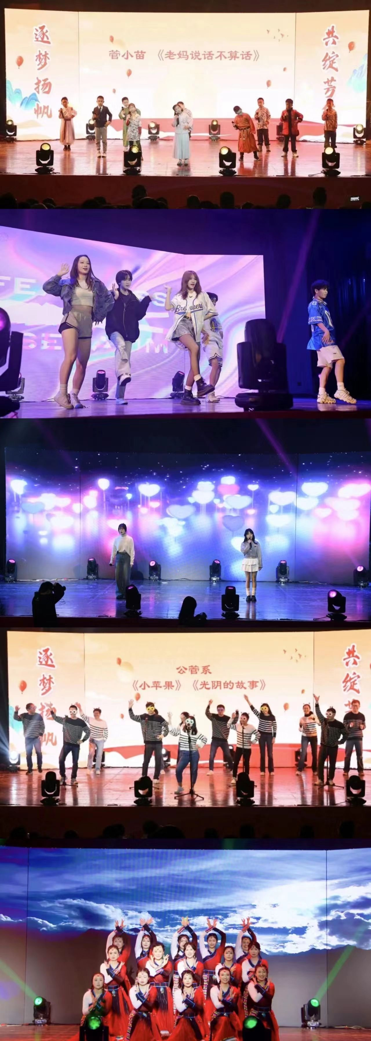 击鼓催征稳驭舟,奋楫扬帆启新程。我辈少年郎,晔晔如扶桑。“你说头悬梁锥刺股,我说小信诚则大信立……”《老妈说话不算话》,管小苗们稚嫩的童声让观众仿佛回到了童年;时光岁月如歌,《光阴的故事》里每个人都在闪闪发光;老龄研究中心大声唱出《你要跳舞吗》,用年轻的节拍诠释澎湃的活力,高凡书记也来到舞台上同大家一起“摇摆”;《小苹果》里公管系的老师们种下希望、渴望收获……我们向往诗和远方,用脚步丈量脚下的祖国山川。《祖国啊,我亲爱的祖国》,拥有独具魅力的风景和独特的文化底蕴,九州一色显巍巍山河。跨江河,听山歌,看白云,让我们在优美的舞蹈中体验《浪拉山情》……