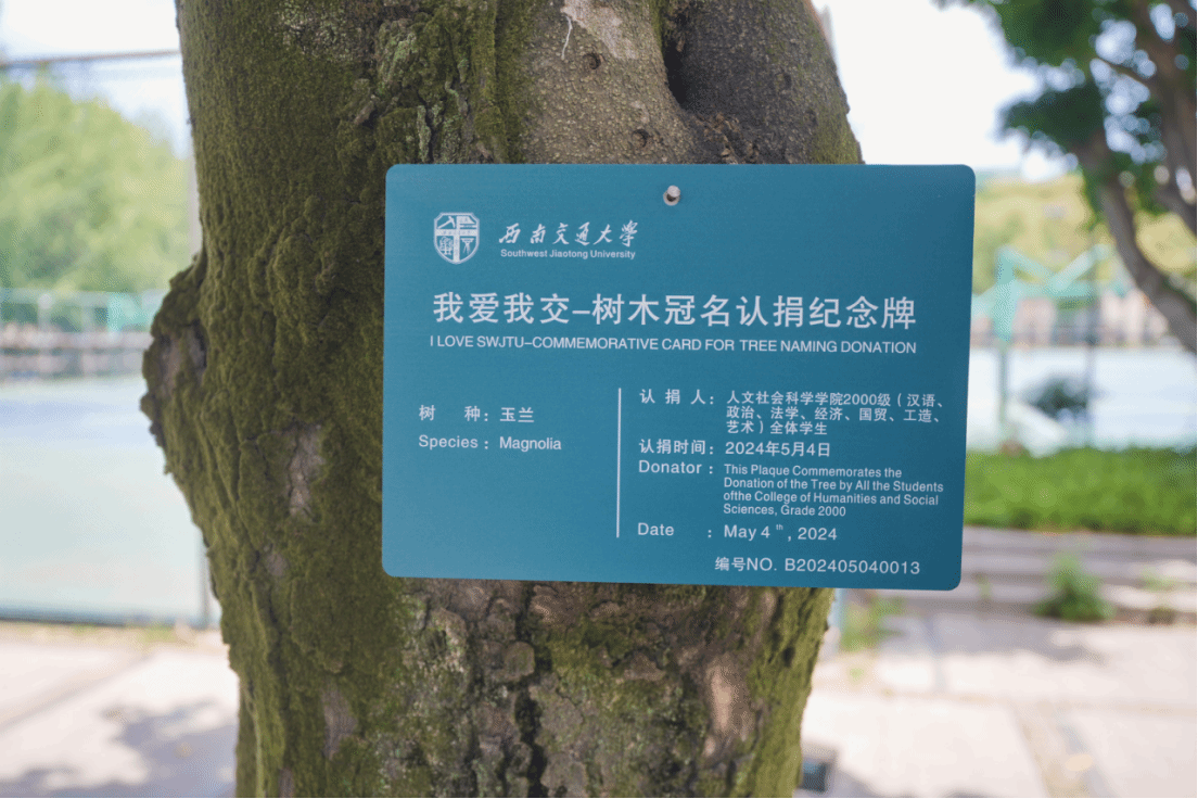 5月4日下午14:00,各位校友参加2000级树木冠名认捐仪式,学校合作发展处阮波副处长出席认捐仪式。校友们冠一方铭牌于碧树,留下的翠绿将代替校友们见证交大的蓬勃发展。