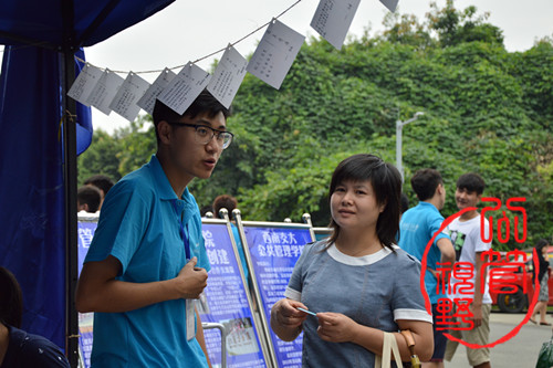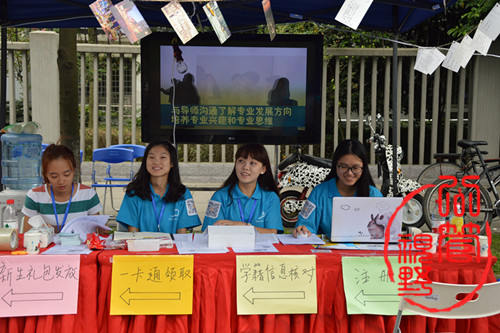 迎新点布置了多媒体设备,全天循环播放学院形象片,介绍学院基本情况、专业设置、学术研究、社团活动等,帮助新生更快地融入大学生活,可谓一大亮点。