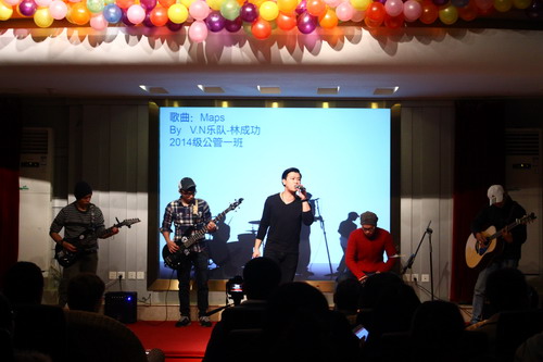 第一篇章,歌舞青春。伴随着动感的音乐和绚丽的灯光,越南留学生乐队V.N的一首《Maps》调动了现场气氛,激起了在场观众的热情,晚会正式拉开序幕。王永杰书记为晚会致开幕词。