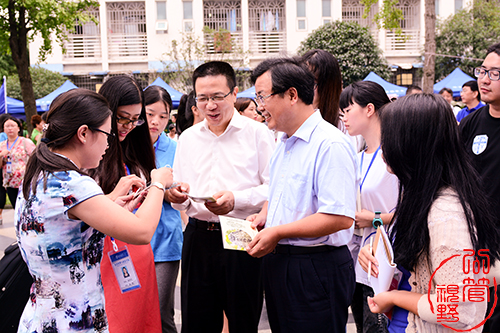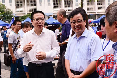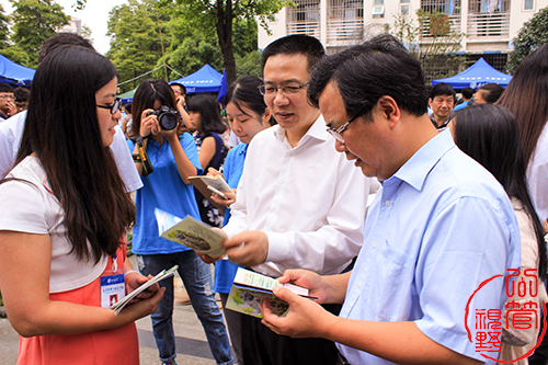 党委书记王顺洪教授和校长徐飞教授来到我校犀浦校区迎新点视察迎新工作,当王书记和徐校长来到公共管理与政法学院前时,学生工作组组长余小英老师向校领导介绍蜜桃视频