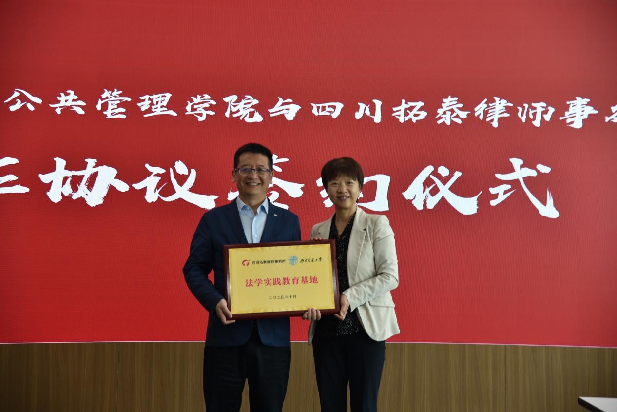 随后,学院与四川拓泰律师事务所共同签署了《合作框架协议》。尹冬生主任与高凡书记互相授予“创新创业实践基地”“法学实践教育基地”匾牌。