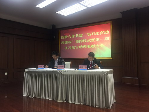 表彰会上,我校公共管理与政法学院陈家宏副院长代表我校与成都市中级人民法院党组成员副院长龚成正式签署了《“实习法官助理课程”合作共建协议书》;并发言强调,成都中院第一期实习法官助理工作,中院相关部门“组织实施得好”、指导法官“指导监督得好”,实习学生“学习参与得好”;认为成都中院率先在全国开展实习法官助理工作并且取得了一定成功经验,创新了司法改革与培养卓越法律人才的融合模式,探索了促进依法治国的可持续、规范的法律人才培养机制,值得总结发扬。陈家宏副院长还表示,我校将大力支持、积极参与院校合作共建活动,诚挚欢迎成都中院的法官、专家来我校讲学、指导。(温雯)