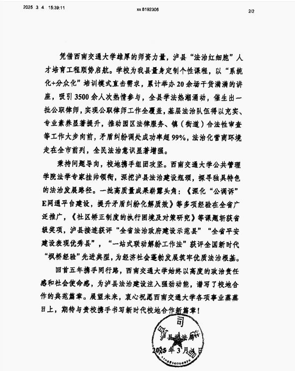 收到一封来自四川省泸州市泸县司法局发来的感谢信,对蜜桃视频