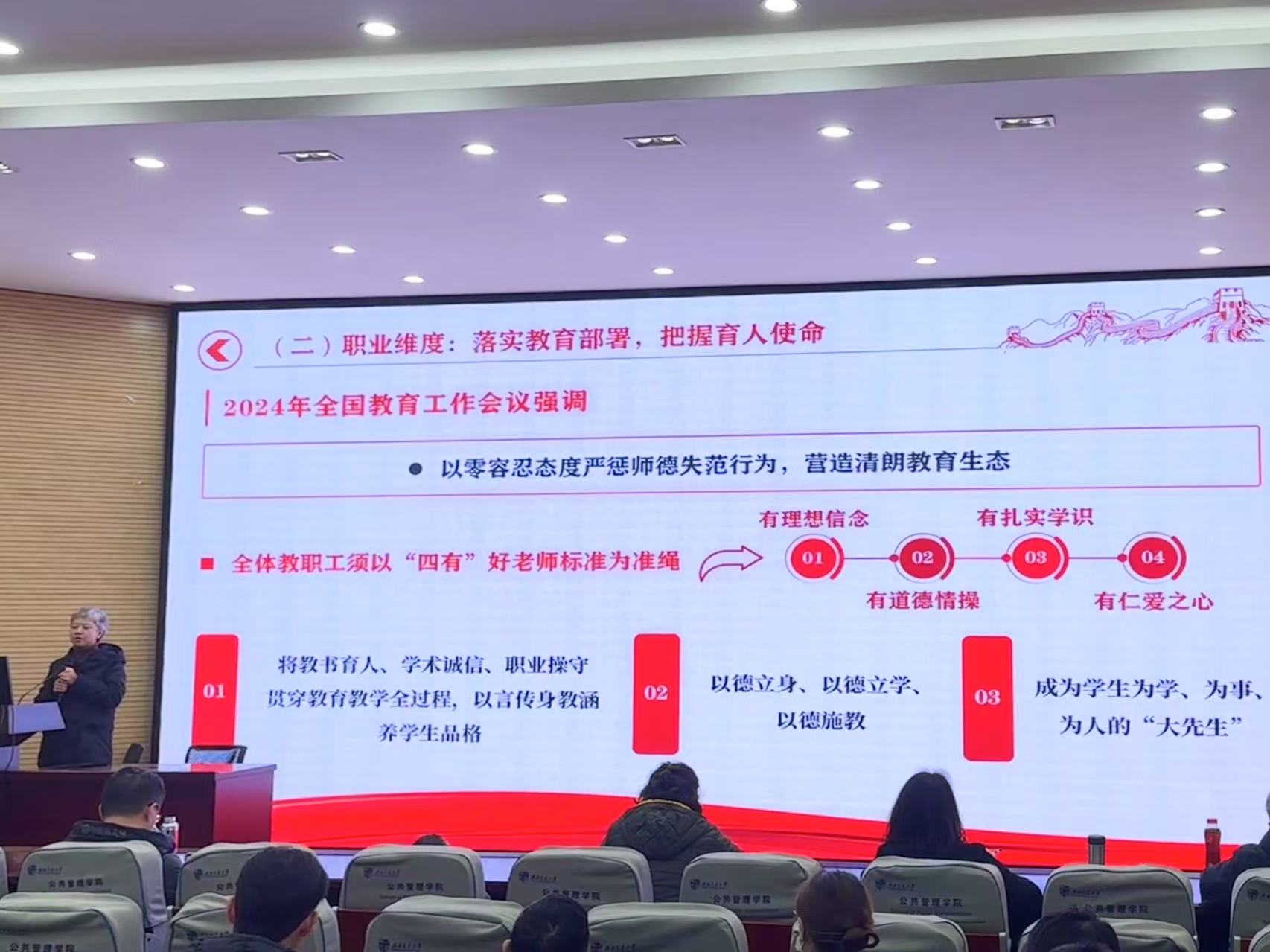 在师德师风警示案例学习环节,高凡结合学术不端、师生不正当关系、发表不当言论等时事热点与典型案例,深入剖析了违纪、违规带来的深刻教训与严重后果。高凡强调,学院全体教职工要自觉遵守法律法规与相关纪律要求,严守师德师风红线,以求真务实的态度、廉洁从教的标准开展教育教学工作,争做新时代“四有”好教师!