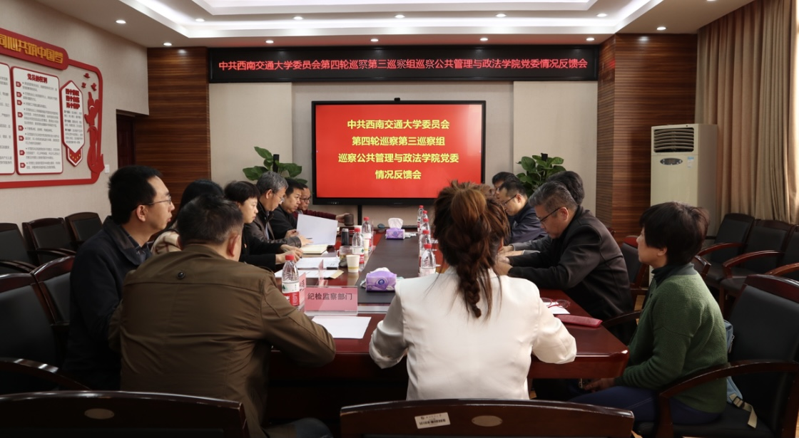 委员会第四轮巡察第三巡察组对公共管理与政法学院党委开展了巡察。巡察组坚持以习近平新时代中国特色社会主义思想为指导,认真贯彻中央巡视工作方针和《中国共产党巡视工作条例》,增强“四个意识”,坚定“四个自信”,做到“两个维护”,以党章为根本遵循,以党规党纪为尺子,对标对表中央巡视关于“四个落实”的总体要求,突出政治导向,聚焦“双一流”建设,聚焦学校新时代“大思政”育人工作体系和“三全育人”工作格局建设,加强“十三个紧盯”。在学院的积极支持和相关部门的配合下,巡察组顺利完成了巡察任务。学校党委巡察工作领导小组听取了巡察公共管理与政法学院的情况汇报,并向学校党委报告了有关情况。