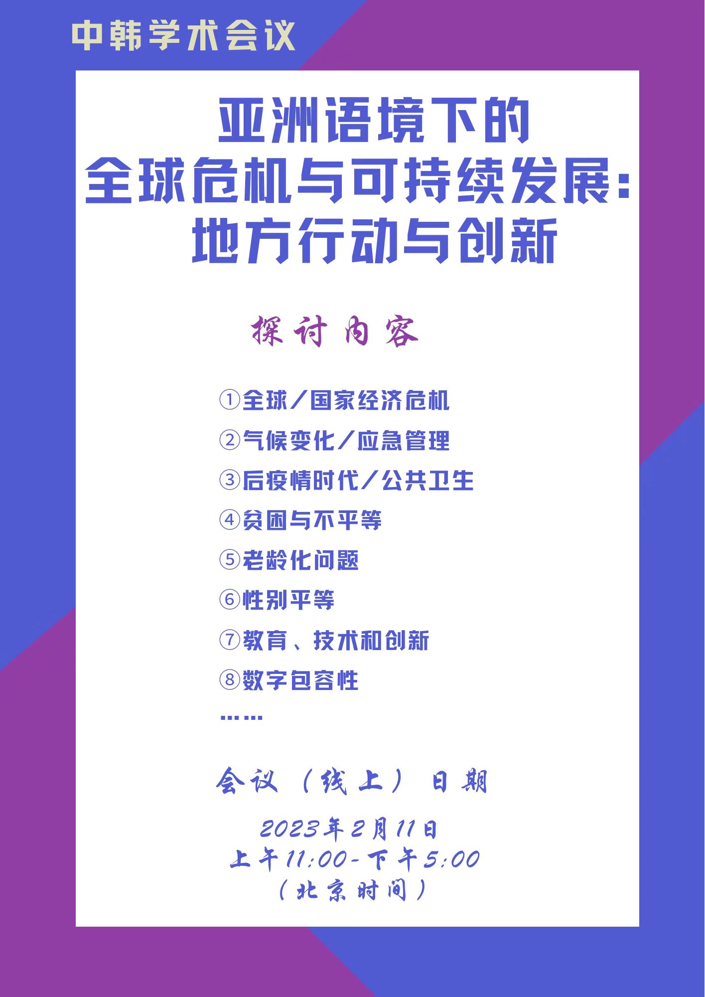 将于2023年2月11日联合举办主题为“亚洲语境下的全球危机与可持续发展:地方行动与创新”的国际会议。会议将尝试从新公共治理和应对当前全球危机的创新解决方案的角度,讨论分析亚洲国家面临的共性和个性化社会问题,以及相应的解决方案,并期待在后疫情时代为重启亚洲各国间研究合作创造新机遇。