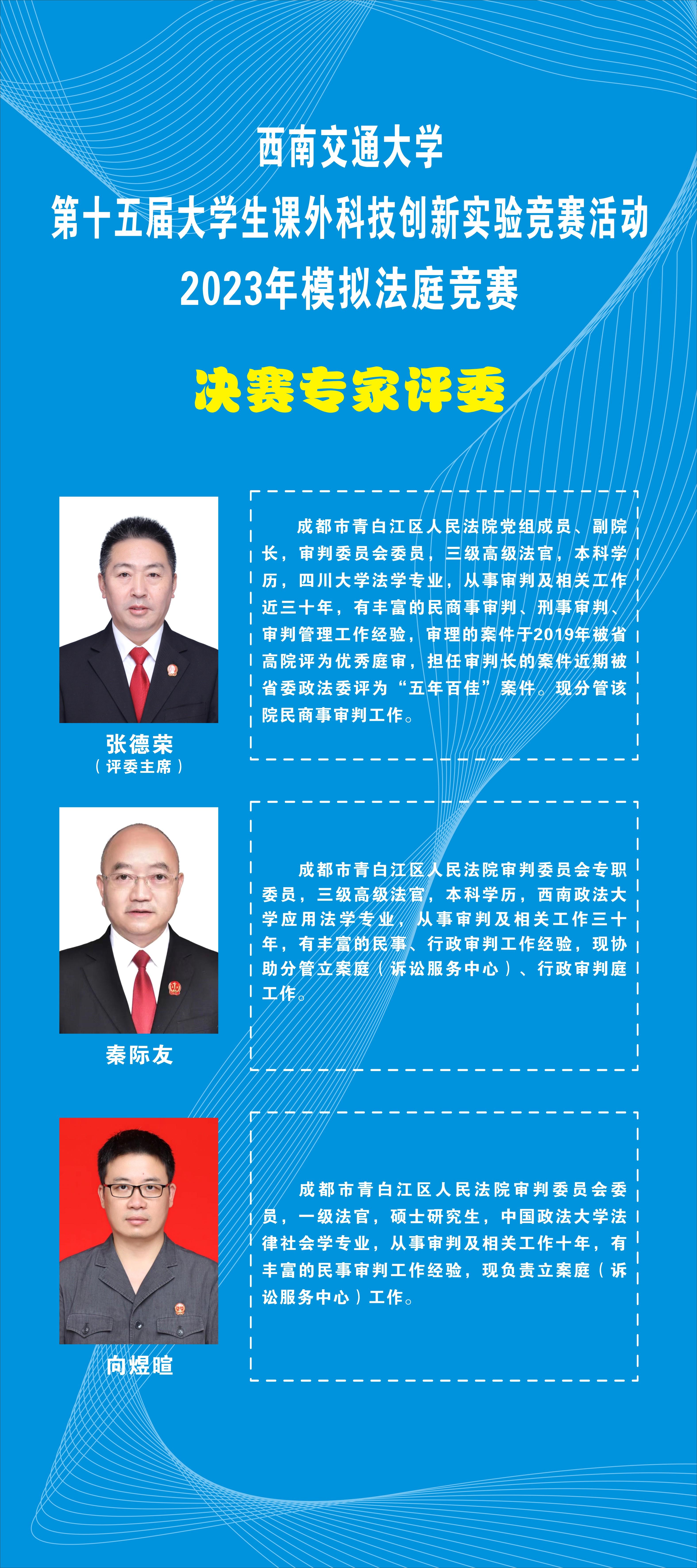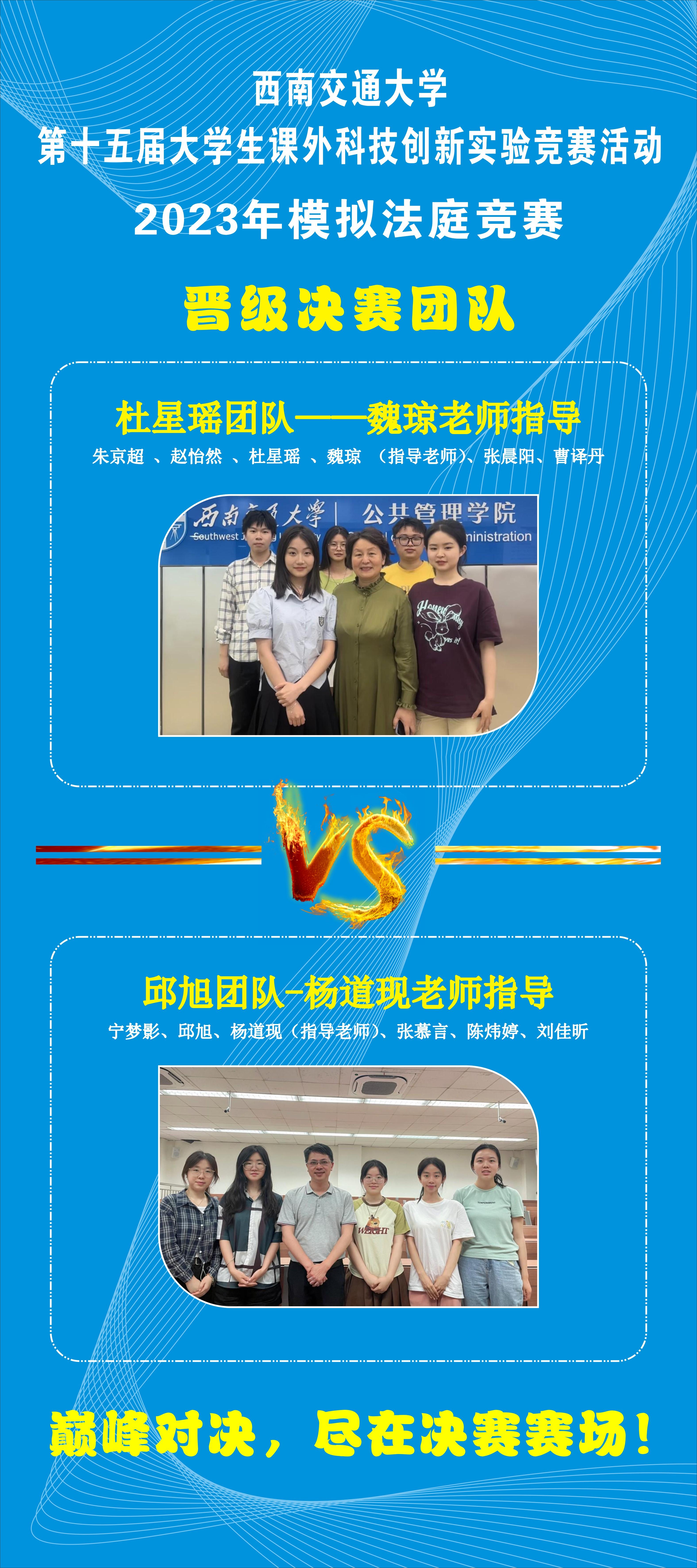 第十五届大学生课外科技创新实验竞赛2023年模拟法庭竞赛在4月初拉开帷幕,经过初赛对18支参赛团队提交的司法文书进行匿名评审以及复赛对晋级的八支参赛团队言辞辩论评审,A、B两组分别有一支参赛团队晋级模拟法庭竞赛决赛,现对决赛赛事安排如下: