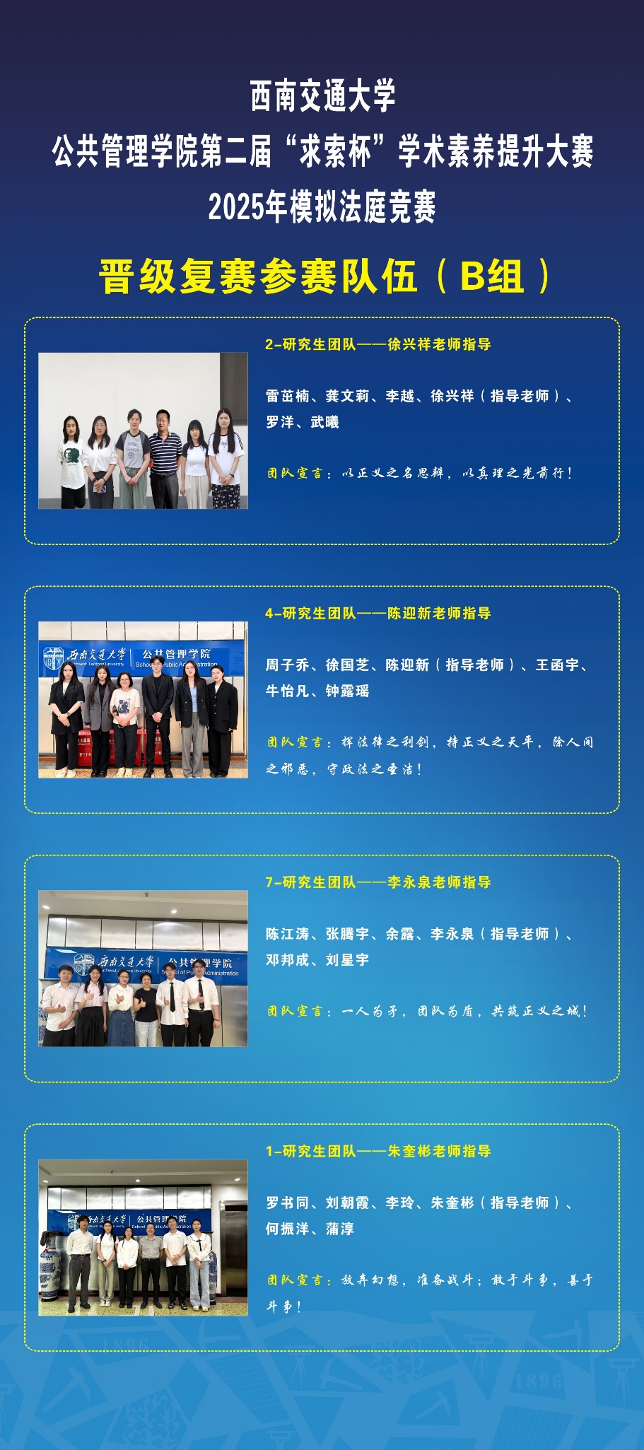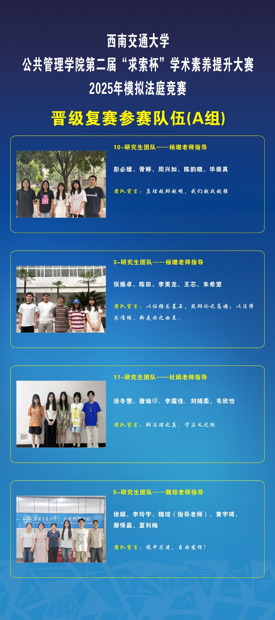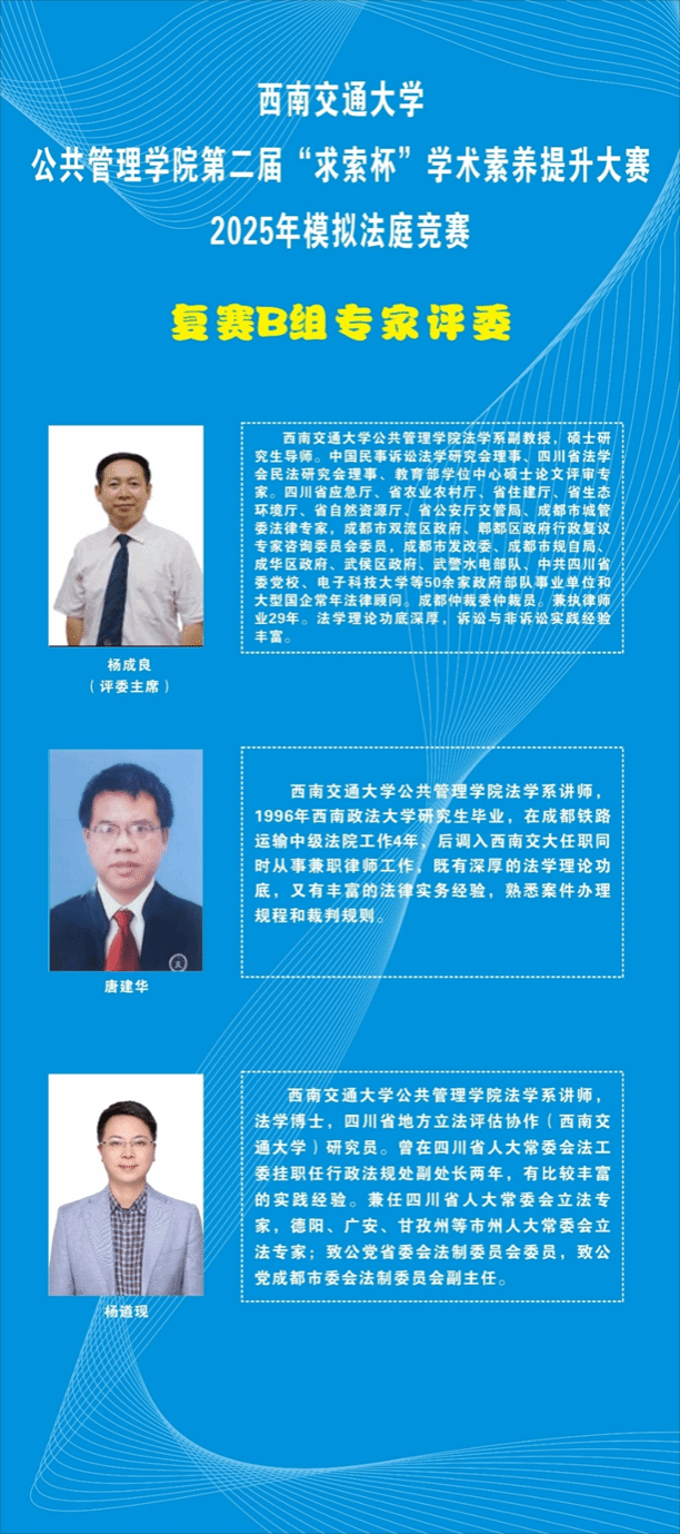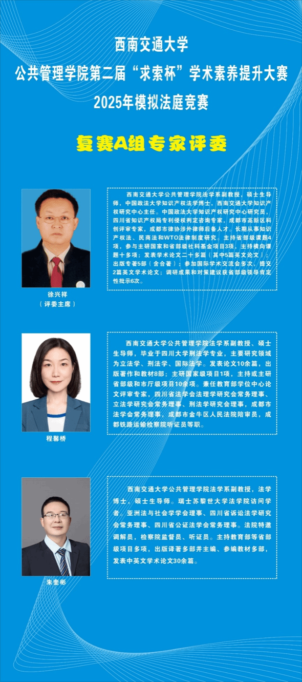 第二届“求索杯”学术素养提升大赛2025年模拟法庭竞赛于4月初拉开帷幕。本次竞赛案例由成都市青白江区人民法院提供,我校研究生组成共11支参赛队参加了本次模拟法庭竞赛。在初赛中各参赛团队根据竞赛案例案卷材料,提交了包括民事起诉状、民事答辩状、代理词、判决书等司法文书,由青白江区人民法院三位法官进行匿名评审,8支参赛队成功晋级,现通过抽签方式,分为A、B两组展开复赛。现对模拟法庭竞赛复赛赛事安排如下: