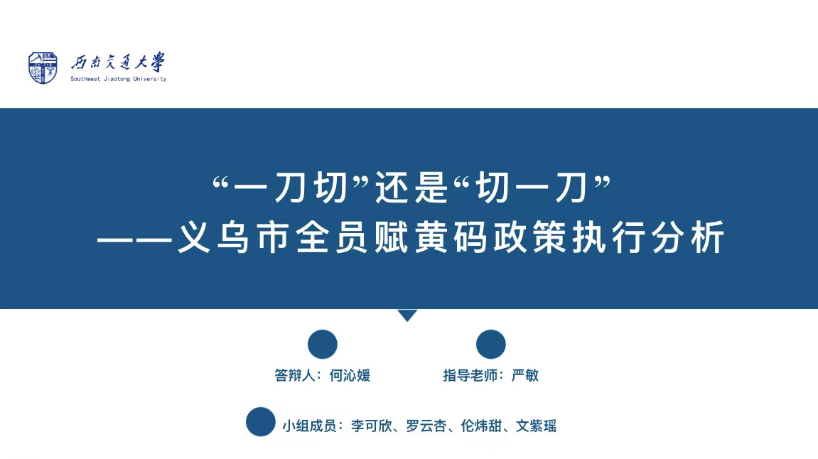 学子在指导老师悉心指导下,完成了从开题报告、调研设计、实地访谈、报告撰写、现场答辩的全过程,历尽数次修改、调整和完善,最终凭借高质量文本《“一刀切”还是“切一刀”——义乌市全员赋黄码政策执行分析》从众多参赛队伍中脱颖而出,与各高校参赛队伍同场竞技、切磋交流,获得评委专家的一致肯定。