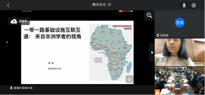 柏林自由大学唐曼以《“一带一路”基础设施互联互通:来自非洲学者的研究》为题进行汇报。她首先分享了非洲学者对“一带一路”的相关研究。她指出,非洲学者以地方性视角发出对“一带一路”倡议的非洲回应,重点关注基础设施建设如何塑造新的图景、如何与本土经济社会关系互动。她介绍,非洲学者并不认同西方对于“一带一路”的种种指控,而是积极肯定这一倡议带来的共赢局面。非洲学者更多关注现实问题,强调应抓住“一带一路”带来的发展机遇,认为“一带一路”倡议下的基础设施建设有利于区域和平发展,促进了中非关系的深入发展。