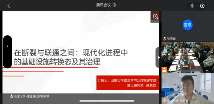 博士研究生庄易霖以《在断裂与连通之间:现代化进程中的基础设施转换态及其治理》为题进行汇报。他指出,基础设施在突发事件中会转变为一种“物质与非物质的不稳定互动关系”,而基础设施治理正是维持或重构这种互动关系的过程。他将基础设施的转换态分为“工具-行动”和“媒介-话语”两种类型,为基础设施转换态这一概念提供了类型学的讨论基础,认为可通过运用话语符号整合社会安全资源,以推动基础设施联结关系的更新,从而进一步提高公共服务的可及性和基础设施发展的可持续性。