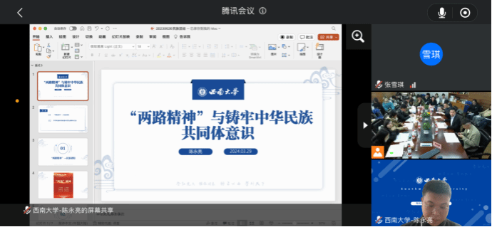 西南大学历史文化学院(民族学院)教授陈永亮以《“两路”精神与铸牢中华民族共同体意识》为题进行汇报。他着重讲述了“两路”精神的重要内涵之一——“民族团结”与铸牢中华民族共同体意识之间的内在联系。他在研究中发现,交通基础设施建设是促进各民族交往交流交融最为有效的手段之一,认为应继续以铸牢中华民族共同体意识为主线、以铁路建设为切入点,通过高质量的口述史调查,以各民族共同的历史记忆构筑中华民族共同精神家园为切口,对“两路”精神展开更为深入的研究。