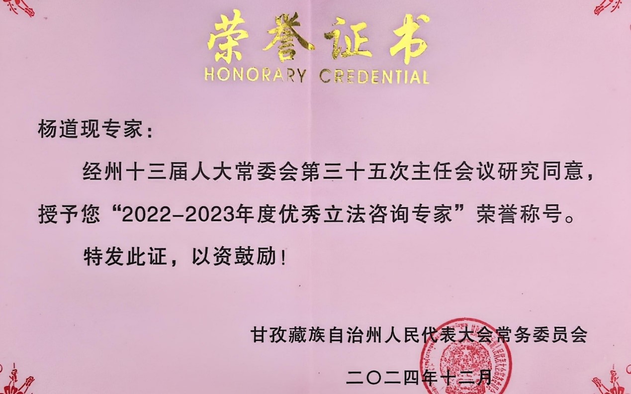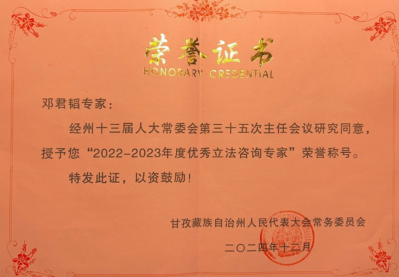 教师邓君韬、杨道现 “2022-2023年度优秀立法咨询专家”荣誉称号。