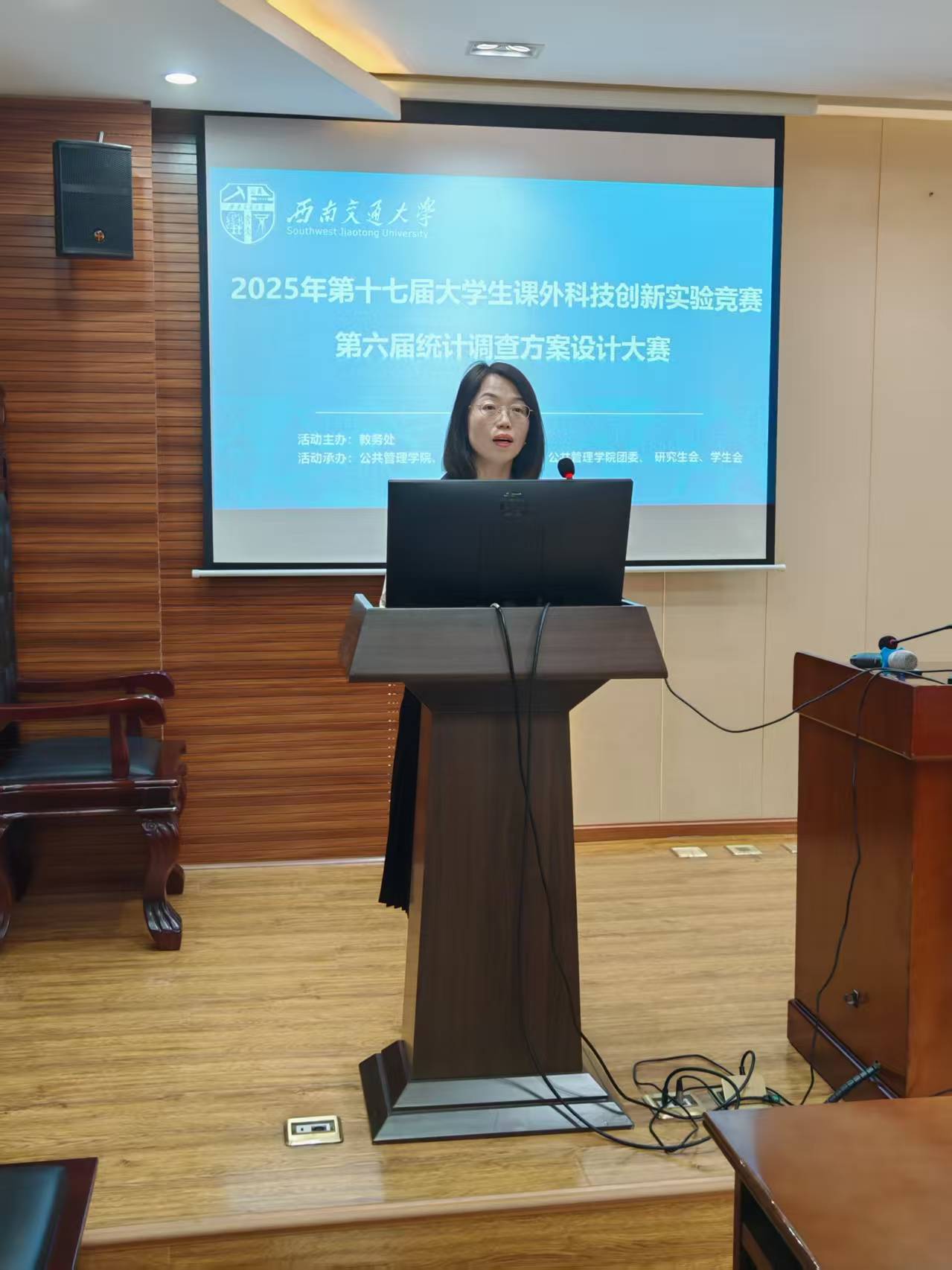 副院长彭川宇为本届比赛致辞。彭老师指出,统计调查方案大赛作为学院传统赛事,为大学生应用统计学基本知识和相关软件来了解分析社会现象提供了重要平台,在大学生社会实践教学中发挥了积极作用。彭院长期待学生借此提升学科素养,预祝比赛圆满成功。主持人介绍完参赛队伍、规则流程后,比赛正式开始。