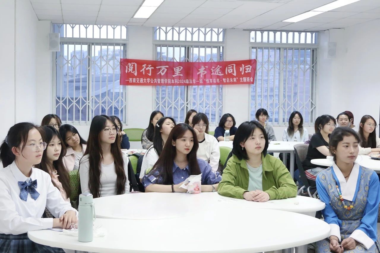 4月24日,本科法学2024-01班在“世界读书日”来临之际,举办以“阅行万里,书途同归”为主题的特色班会。班会以“书海寻踪”游戏破冰,为班会营造出轻松氛围。在“双导游带你看世界”环节中,夏永梅老师与陈泽东老师分享自身经历,鼓励同学培育阅读兴趣。“三人行,必有我师”环节中,三位同学结合家乡特色分享《哦,香雪》《画山绣水》《藏族风俗习惯》三本书籍。班会尾声,高凡书记以“read the word,read the world”为感悟,提出“阅读,悦读,越读”理念,鼓励同学坚持阅读,不断成长沉淀。随后班级成员于杜甫草堂开启“阅行合一”研学之旅,并于结束后收集同学反馈,收获广泛好评。、