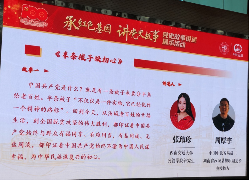 为深入学习贯彻习近平新时代中国特色社会主义思想,以优异成绩迎接中国共产党建党100周年,深化党史学习教育成效,学校与中国中铁五局联合开展“承红色基因 讲党史故事”展示活动,本次活动于2021年6月16日在蜜桃视频