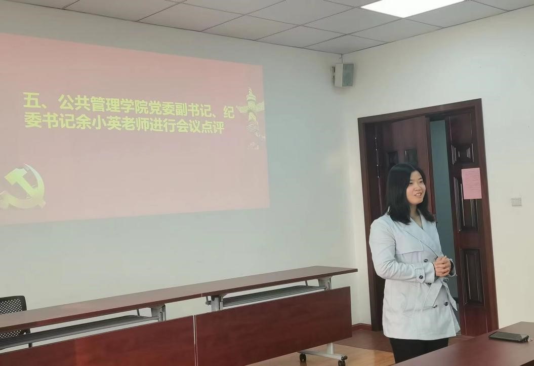 会议临近尾声,余小英书记对本次专题组织生活会情况进行了点评,余书记对党支部的各项工作完成情况表示赞扬,并指出每个党员在自我批评和互评时敢于揭短亮丑,真正触及问题。余书记对这次专题组织生活会提出了宝贵的意见,并且给予了很高的评价,这既是对我们的肯定,更是对我们的勉励和鞭策。