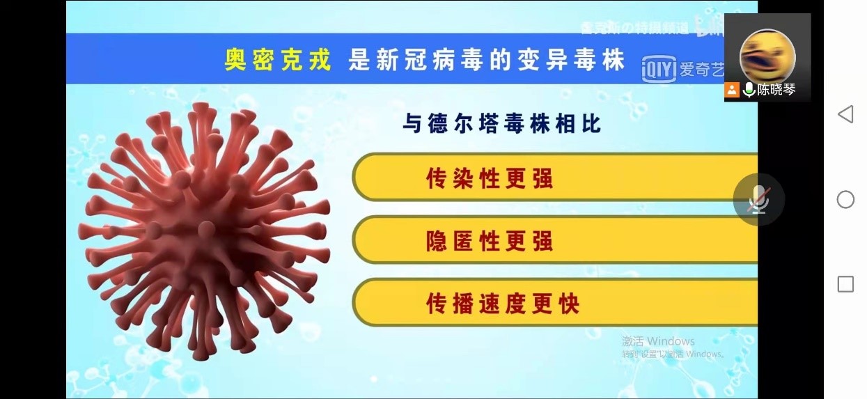 其次是“奥密克戎变异毒株的科普介绍”视频短片。短片中将两年来所出现的病毒名称和病毒变异进行了简易、深刻的阐释。日前“奥密克戎变异毒株”已经造成大量感染者,并且隐匿性更强,传播速度更快。并且隐匿性强更容易让感染者误以为是普通感冒或者是季节性流感,这也给预防和控制工作带来了不小挑战。最后给予“佩戴口罩、勤洗手、常通风、不聚集、不离汉、保持社交距离”六大方面注意事项助力疫情防控。
