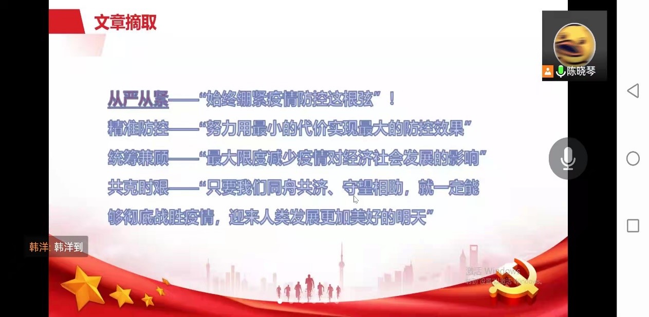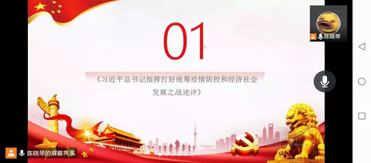 面对世纪疫情的跌宕反复,习近平总书记亲自指挥、亲自部署,以科学之策应对非常之难,以办好发展和安全两件大事的非凡实践,团结带领亿万人民打好统筹疫情防控和经济社会发展之战。习近平总书记在会议上强调,各地区各部门各方面要深刻认识当前国内外疫情防控的复杂性、艰巨性、反复性,进一步动员起来,坚定思想,坚定信心。为深入学习和落实习近平总书记指挥打好疫情防控和经济发展之战中“始终坚持人民至上、生命之上”的强烈号召,硕士2020级公共管理第一党支部于2022年4月13日晚7点30在腾讯会议开展“携手同心 共守校园”主题党日活动。会议由党支部书记陈晓琴主持,全体党员同志和积极分子参加。活动共分为两项议程: