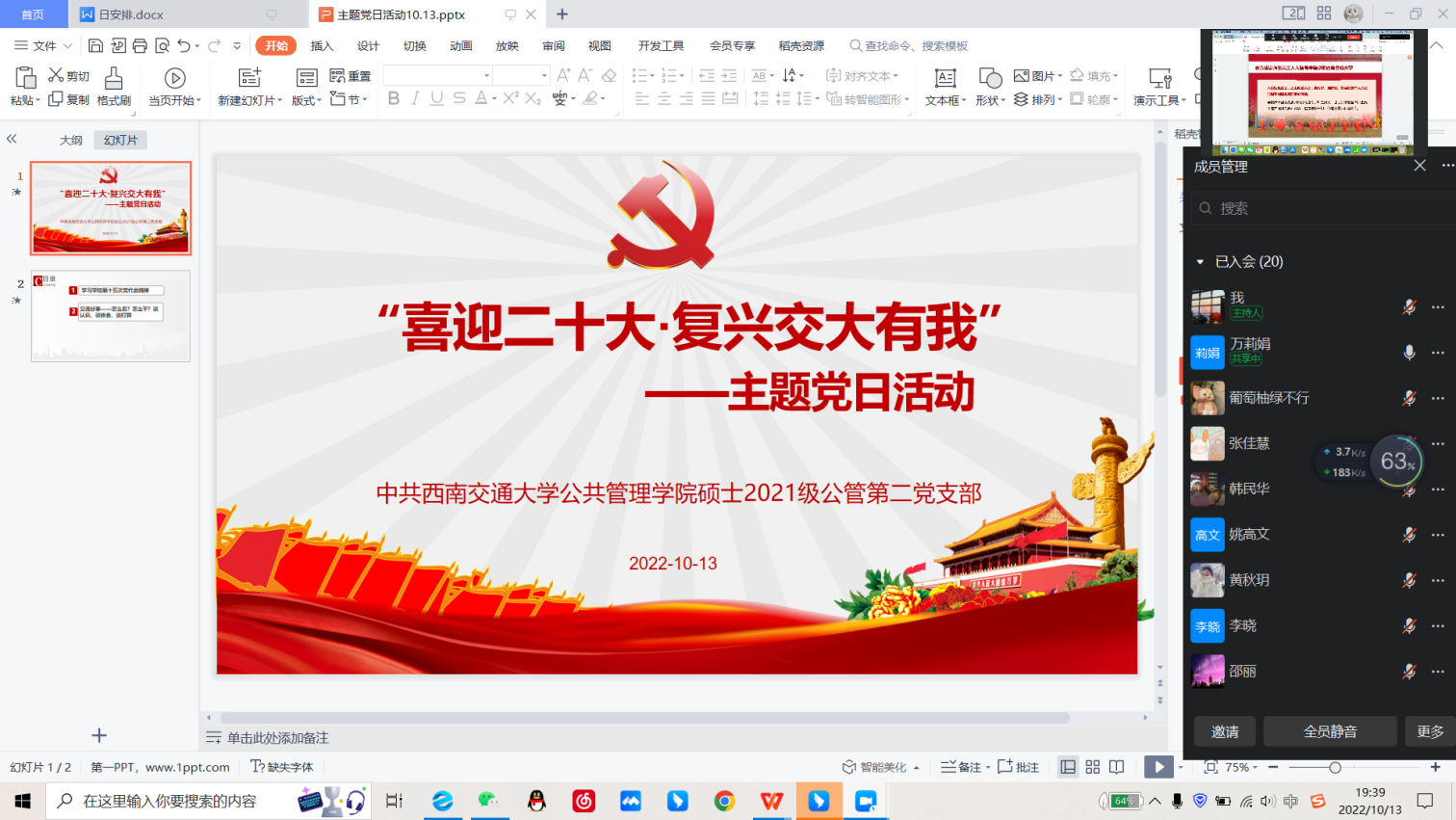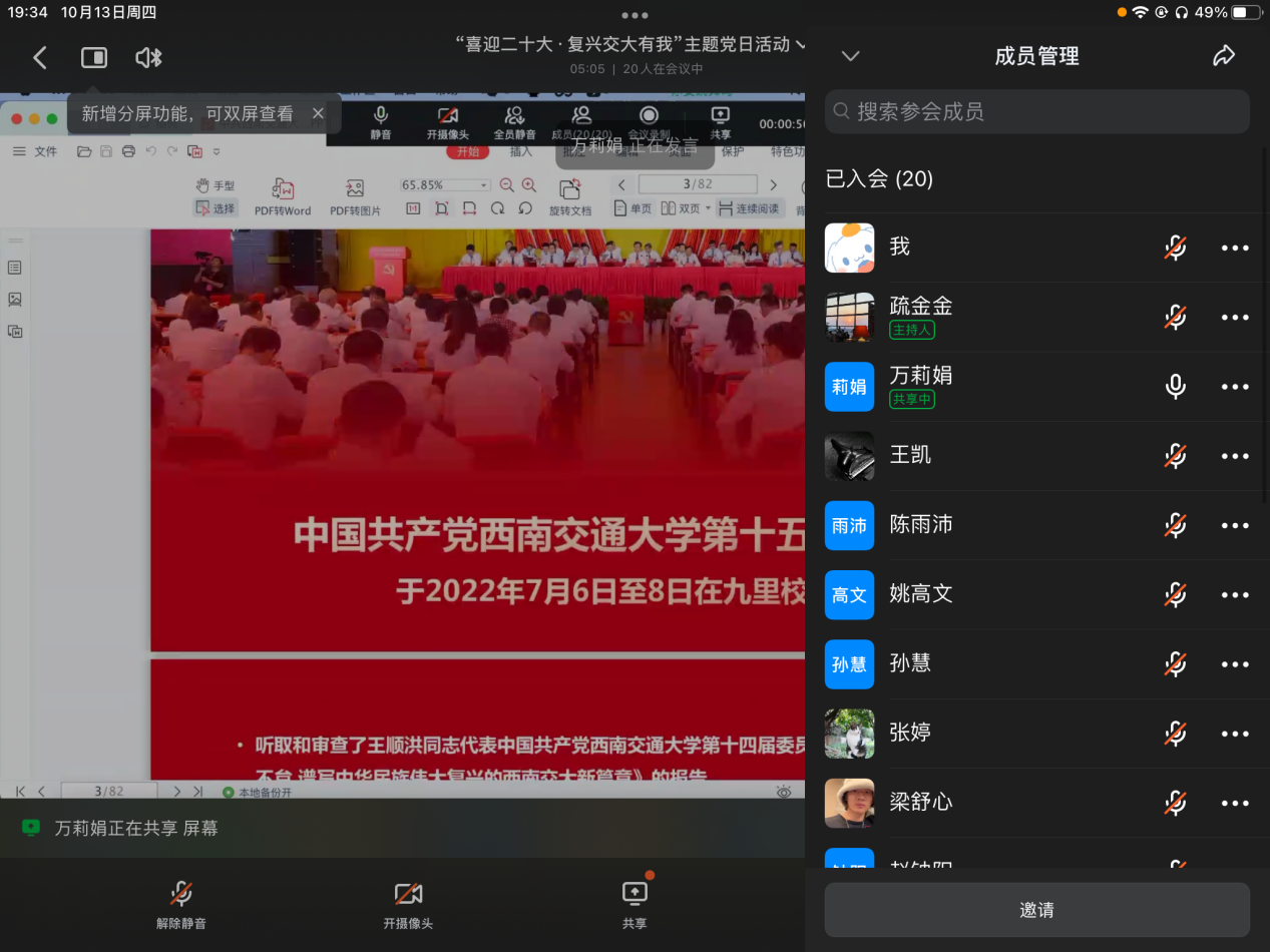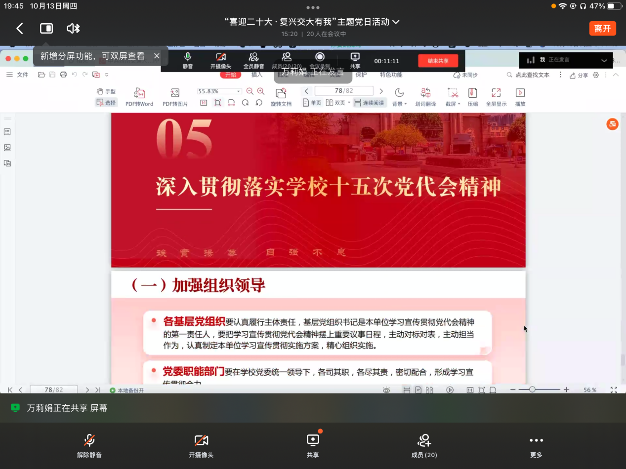 第十五次党代会精神,为学生党员成长成才指引方向,2022年10月13日晚,硕士2021级公共管理第二党支部在支部钉钉群通过钉钉会议开展了主题党日活动。本次学习以“喜迎二十大·复兴交大有我”为主题,开展贴近党员实际、主题突出、内容丰富的主题党日活动,组织党员深入学习学校第十五次党代会精神。硕士2021级公共管理第二党支部全体党员参加了此次学习活动,活动由党支部书记疏金金主持、支部成员万莉娟同志主讲,各位党员同志对本次大会重要精神及报告内容进行了学习,并展开了热烈讨论。