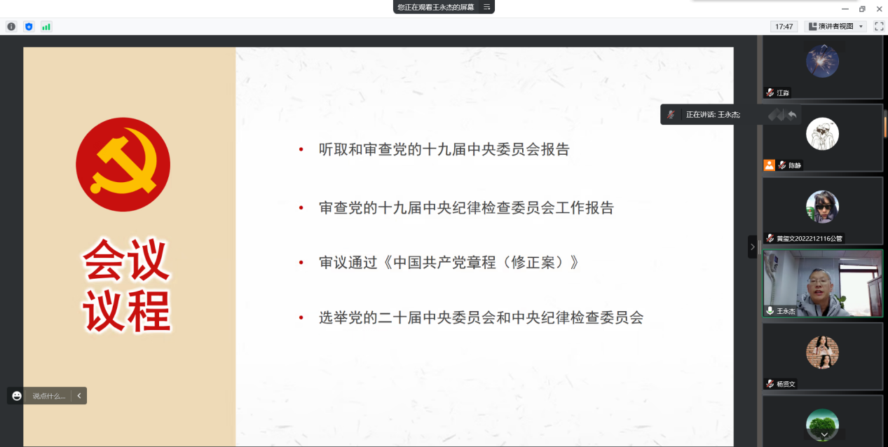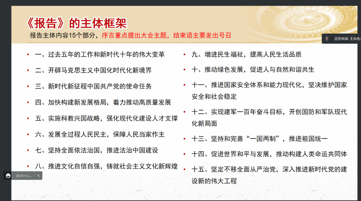 教工法学系党支部和硕士2022级法学第一党支部邀请学院党委委员、院长王永杰教授在腾讯会议为大家开展学习二十大专题党课宣讲活动。