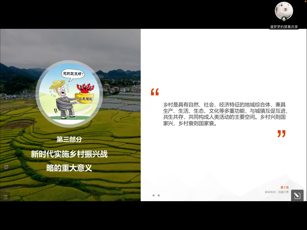 刘祥龙代表的小组给大家展示的是《学习二十大精神主题汇报——乡村振兴》,他首先介绍了乡村振兴的战略演变以及战略举措,全面建设社会主义现代化国家,最艰巨最繁重的任务仍然在农村,我们要坚持农业农村优先发展。然后他讲述了产业振兴、文化振兴、人才振兴、组织振兴和生态振兴五个方面的分类攻坚。接着刘祥龙给大家讲解到乡村振兴的战略意义,最后他分享了目前乡村振兴取得的一些现实成就。