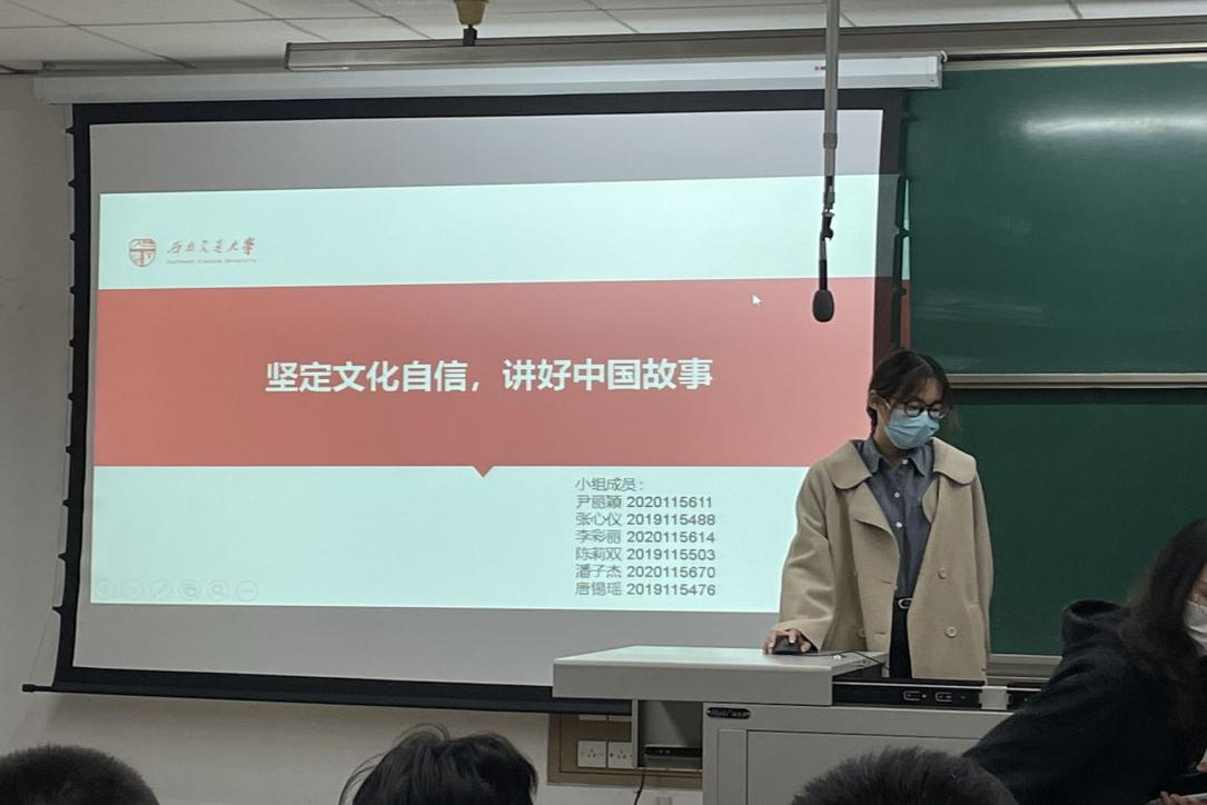 尹丽颖代表第二组给大家展示的是《坚定文化自信,讲好中国故事》,她首先从河南卫视的“唐宫夜宴”引入,展示了传统文化瑰宝在现代焕发新的活力。然后组内第二位发展对象接着给大家讲述人工智能时代的文化自信,最后和大家分享了学习的心得体会:文化兴国运兴,文化强民族强。在如今,文化自信已经贯穿到国家发展,民族复兴的方方面面。在二十大报告的各个方面都有具体鲜明的体现。