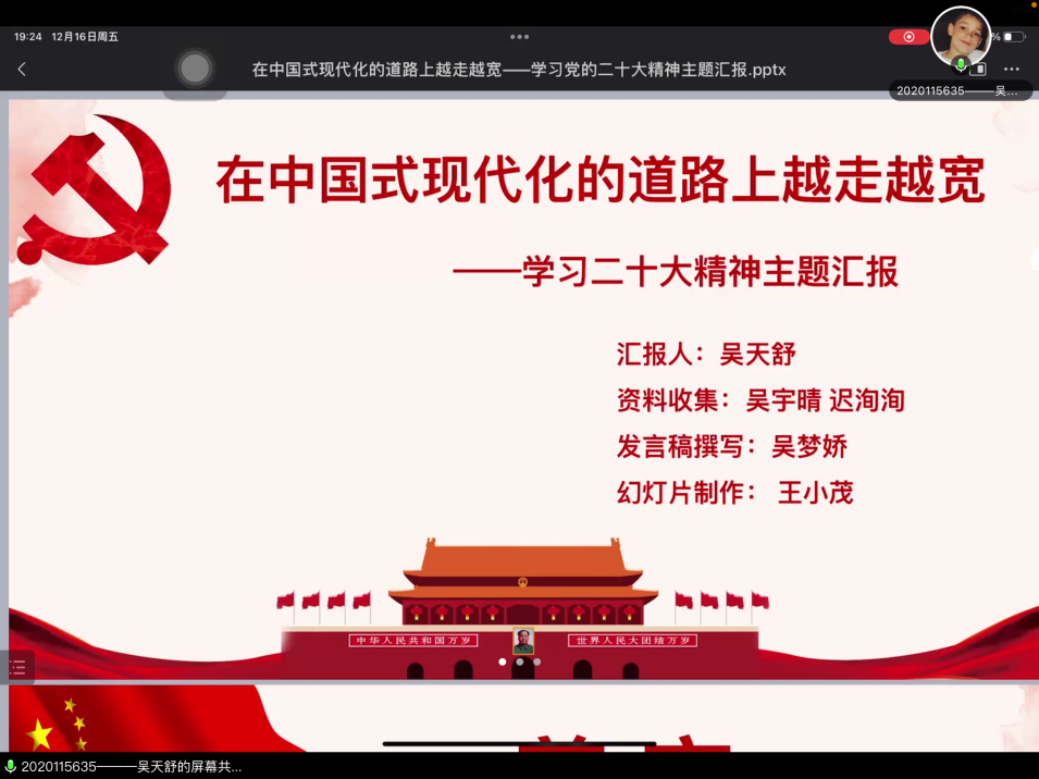 以吴天舒为代表的小组,给大家汇报的是《在中国式现代化的道路上越走越宽》,吴天舒首先对中国式现代化的发展历程进行了追溯。然后介绍了中国式现代化的基本特征和本质要求。最后分享了一些中国式现代化的故事:“深圳故事”和“一带一路故事”。广大新时代青年,对中国式现代化要知其然、知其所以然、知其所以必然,要深刻理解中国式现代化的中国特色、本质要求和推进中国式现代化建设的重大原则。