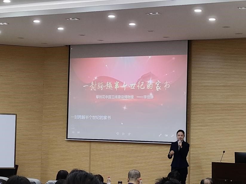 然后,攀枝花中国三线建设博物馆专职讲解员韦堂艳老师为大家带来了“巾帼不让须眉 致敬她力量”——攀枝花开发建设时期“六金花 八闯将”杨桂兰的故事。杨桂兰在三线建设战线上快速成长,背后的艰辛和超乎寻常的付出,都是为了搞好建设。韦老师声情并茂的讲述让在场的同学们都如临其境,感慨万千。