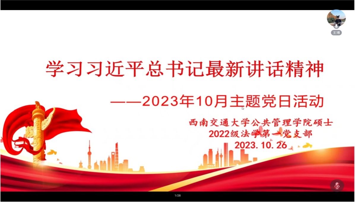 硕士2022级法学第一党支部以腾讯会议的形式开展了“学习习近平总书记最新讲话精神”主题党日活动。本次学习由第三党小组同志主讲,全体党员和入党积极分子参加。