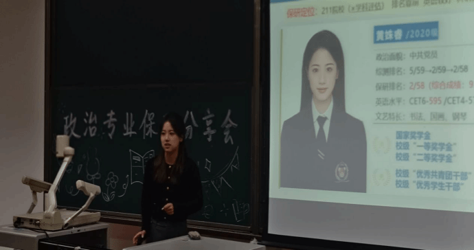 顾歆语、黄姝睿、黄凯三位同志从最基本的保研要素——成绩入手,为我们讲述了保研过程中应该注重什么,应该舍弃什么,如何抓住学科中的重点,怎样了解保研流程和学校相关的推免政策,提醒同学们要注重保研过程心态调节和体质关注;同时将英语学好作为自身的优势,为自己争取更多的机会。