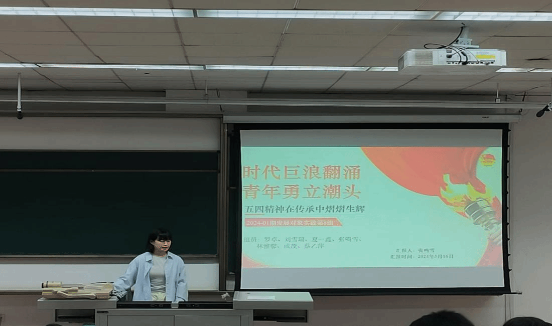 组织2024- 01期发展对象在J4106教室开展了第一次社会实践活动。本次实践活动主要是以五四运动为主题的汇报活动。