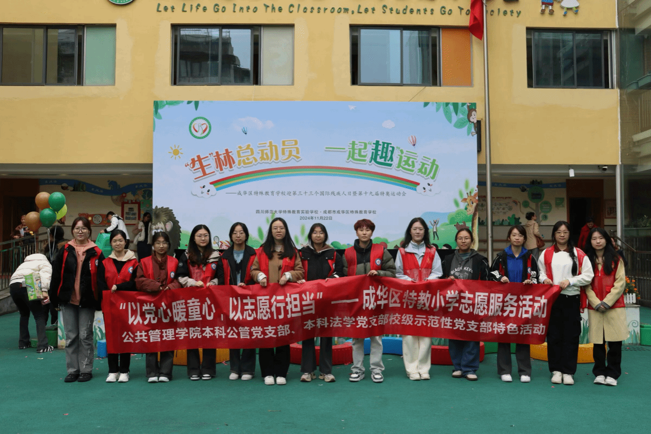 本科公管党支部、本科法学党支部赴成华区特教小学开展志愿服务活动,在特教小学特奥运动会中,共同携手百余名小学生开展运动项目,让孩子们感受到关爱和温暖。