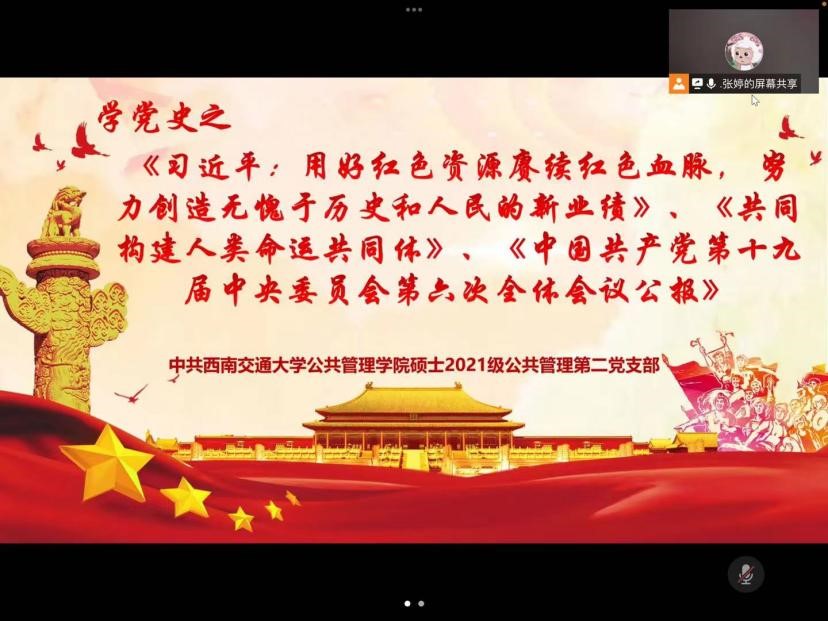 2021年11月13日晚九点,硕士公共管理2021级第二党支部全体党员同志参与党史学习教育专题之学习《习近平:用好红色资源赓续红色血脉,努力创造无愧于历史和人民的新业绩》、《共同构建人类命运共同体》、《中国共产党第十九届中央委员会第六次全体会议公报》,此次活动由党支部书记张婷主讲。
