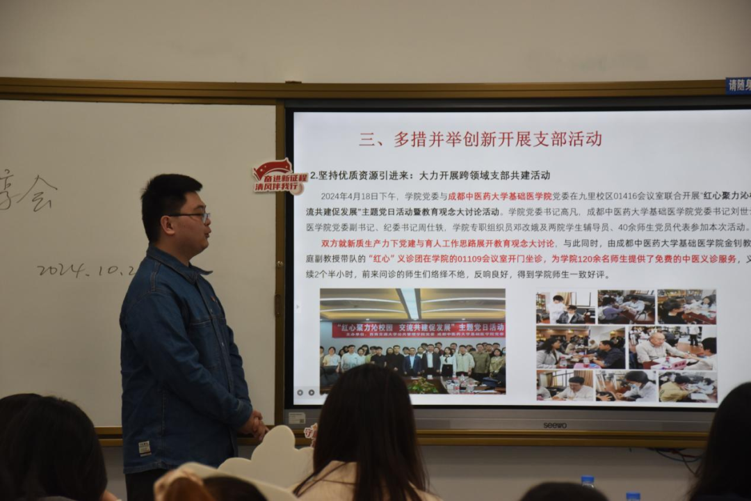 对于新时代廉洁党政工作的理解和作为,学院秉持以“廉”促教、以“廉”育人的工作理念,把加强校园廉洁文化建设作为一体推进“三不腐”的基础性工程和落实立德树人根本任务的重要举措,持续深耕校园廉洁文化建设,打造廉洁文化教育阵地,推动清正廉洁政治底色根植人心;成都中医药大学的学生党员代表文莎莎,则是以案例带领大家深入思考,警示同学们不能犯红线错误,要留清白在人间。并在展示的过程中,抛出问题“青年何以清廉”将廉政建设的种子播撒在每个人的心中;最后是西南财经大学的学生党员代表毛鑫硕,鲜明直接的切入主题,分享了在新时代廉洁文化建设中,西南财经大学党支部的角色定位和具体作为。