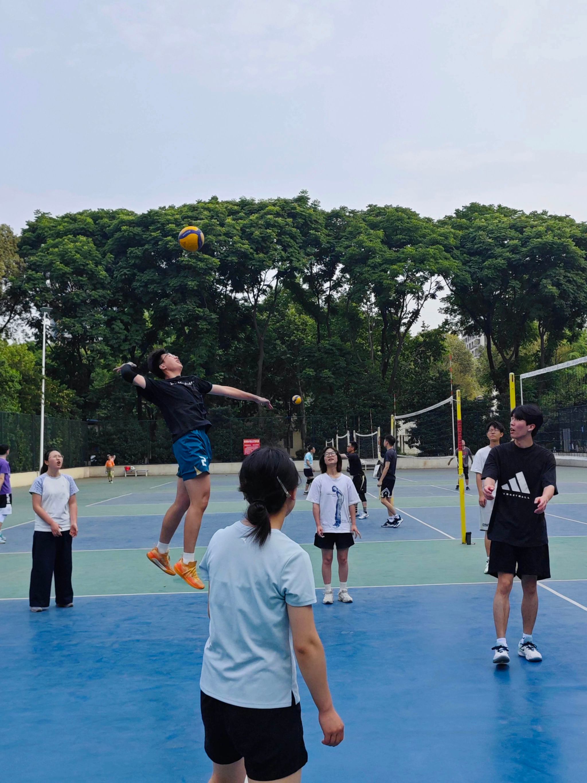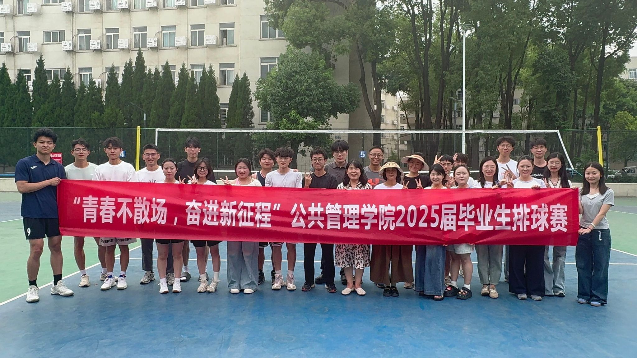 主办,学院学生会组织承办的毕业季系列活动之师生排球赛,于5月21日下午5:00在九里校区排球场火热开赛。“疯狂公管队”与“有东哥在一定会赢队”两支队伍展开激烈角逐,为现场观众带来了一场体育盛宴。