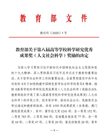 It is reported that the Outstanding Achievement Award of scientific Research in institutions of higher learning (Humanities and Social Sciences) of the Ministry of Education is the most credible and influential heavyweight award in the field of humanities and social sciences in China. In order to thoroughly study and implement Xi Jinping Thought on Socialism with Chinese Characteristics for a New Era and the spirit of the 19th National Congress of the Communist Party of China (CPC), thoroughly implement General Secretary Xi Jinping's important statements on education and philosophy and social Sciences, and fully implement the opinions on Accelerating the Construction of Philosophy and Social Sciences with Chinese Characteristics issued by the CPC Central Committee, the Ministry of Education organized and carried out the evaluation of the 8th Academy Of Higher Education Award for Outstanding Achievements in Scientific Research (Humanities and Social Sciences) in accordance with the Measures for Awards for Outstanding Achievements in Scientific Research in Institutions of Higher Learning (Humanities and Social Sciences). A total of 1,539 achievements (including those of Universities in Hong Kong and Macao) have been awarded prizes after expert evaluation, public publicity, review and approval by the Award committee and the Ministry of Education. Among them, there were 1241 awards for works and papers, including 152 first prizes, 783 second prizes and 306 third prizes. There were 77 consulting service report awards, including 10 first prizes, 47 second prizes and 20 third prizes. 20 awards for popular reading books; 201 youth achievement awards.