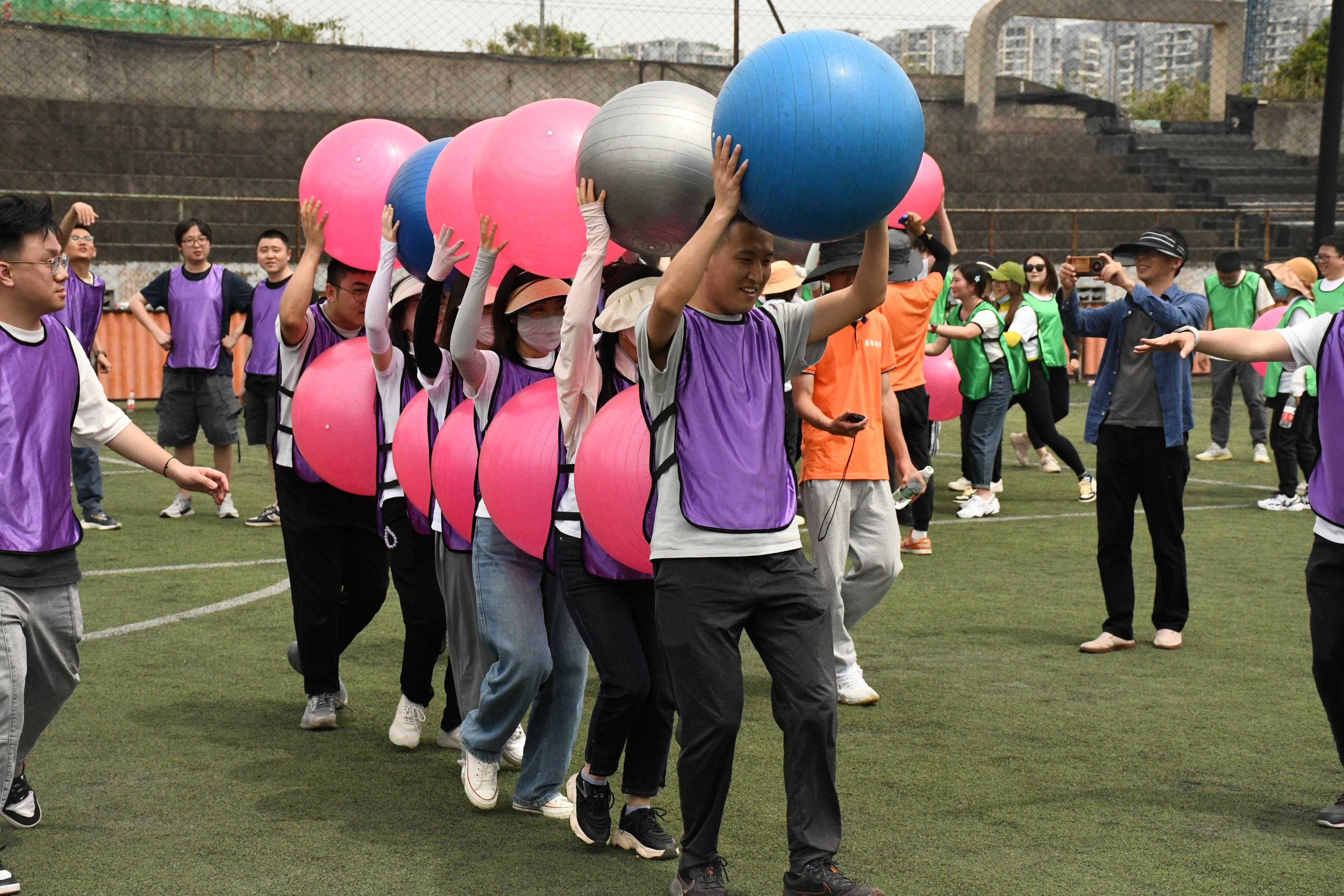 手举皮球,蜈蚣竞走。选手们相互用身体前后夹着大皮球,同时双手举起另一个大皮球,在球不落地的情况下,列成纵队,向前奔跑。双脚一起一落间,共同迈进,不仅考验着选手的协调力,更考验着他们相互配合的默契度。