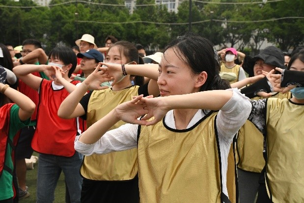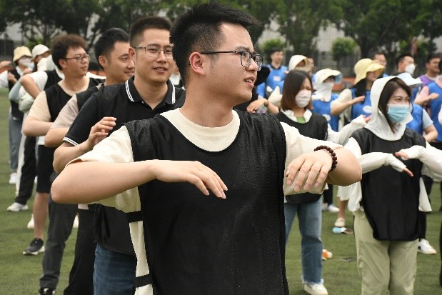 摩拳擦掌,蓄势待发。“动动手,弯弯腰,一起来跳健身操”。随着音乐响起,全体同学跟随教练的“舞姿”在运动场上活动筋骨、舒展身躯。参赛选手们情绪高昂、跃跃欲试,脸上洋溢着灿烂笑容。谈笑风生间,一股浓烈的“火药味儿”在赛场上弥漫开来。