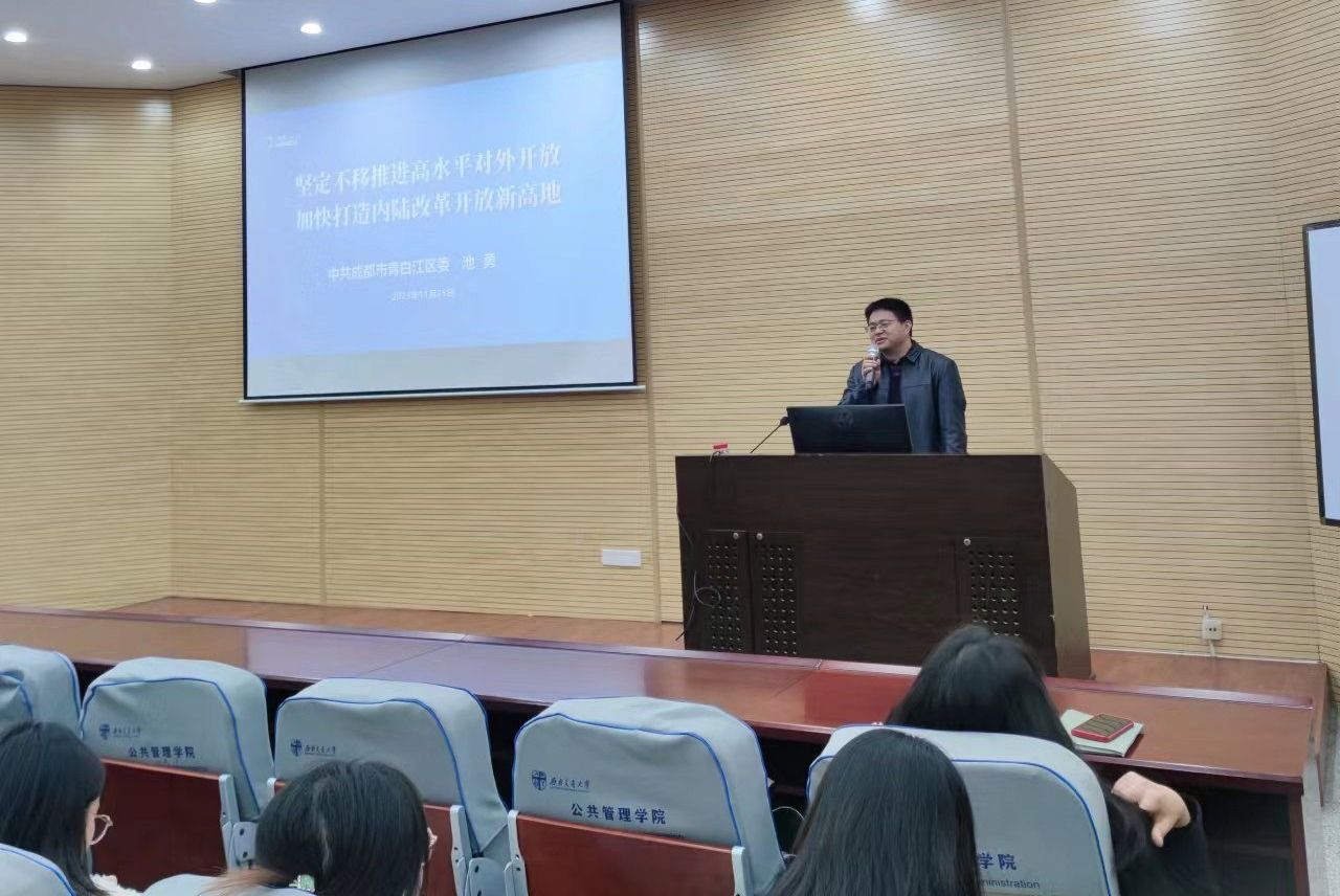 随后,池勇学长立足于青白江区发展现状,从坚持问题导向,从抓住门户“关键棋”、提升物流产业“变革棋”、下好中试产业“先手棋”、拿下乡村振兴“制胜棋”、走好民生事业“连环棋”几方面向参与讲座的师生们介绍了青白江高质量发展战略布局。池勇学长指出,青白江区要实现开放立区,思想解放要放在首位,通过融通更高水平的开放通道、开放平台、开放性经济、开放环境、开放合作和开放保障等措施,实现高水平开放的落地落实。